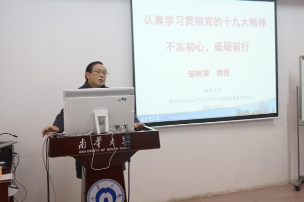 2017年12月17日晚上8点,核设施应急安全作业技术与装备湖南省重点实验室(以下简称实验室)举办了关于承办南华大学第十一届楚岳节分论坛活动的学术交流讲座 — 认真学习践行党的十九大精神,不忘初心,砥砺前行。本次学术讲座在实验室会议室举行,邀请博士生导师邹树梁教授为我们主讲,会议由机械学院副院长唐德文副教授主持,参会人员有实验室的全体老师和同学。